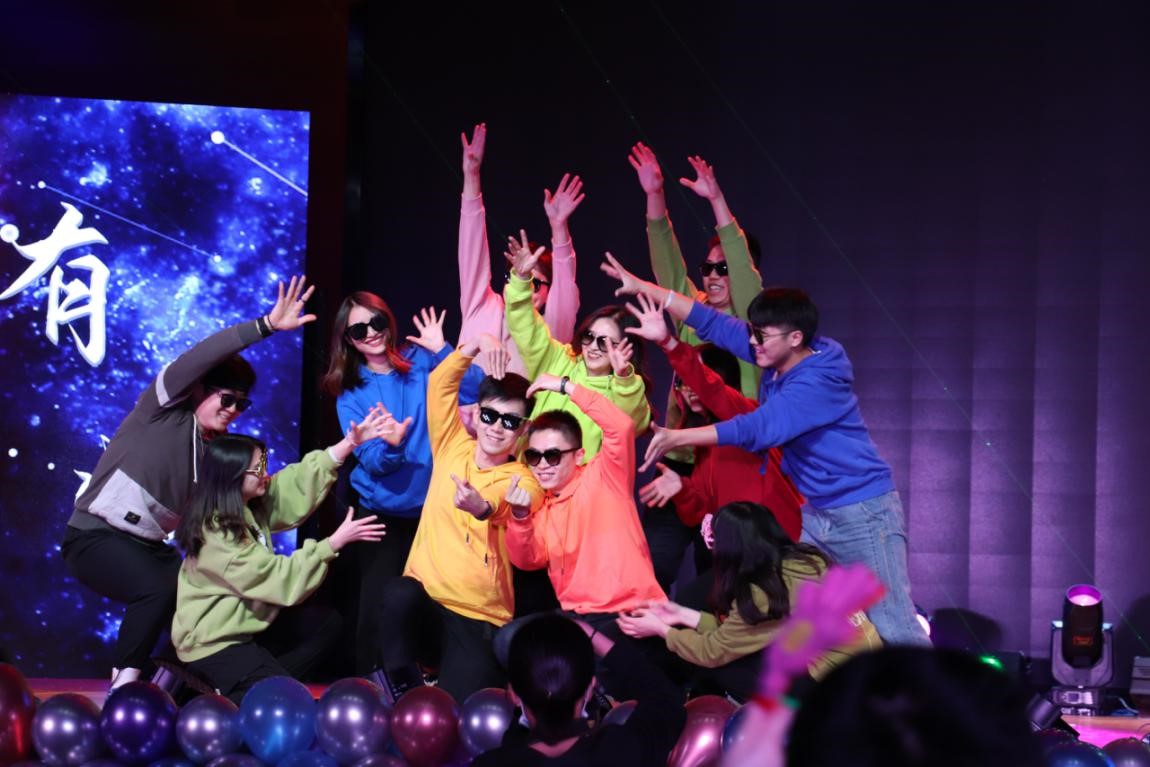 第五个节目是由学工组带来的神秘节目。他们活泼可爱的形象让同学们看到平日里不一样的辅导员老师们,同学们都纷纷拿起荧光棒为他们的节目喝彩,场上气氛一度达到高潮。