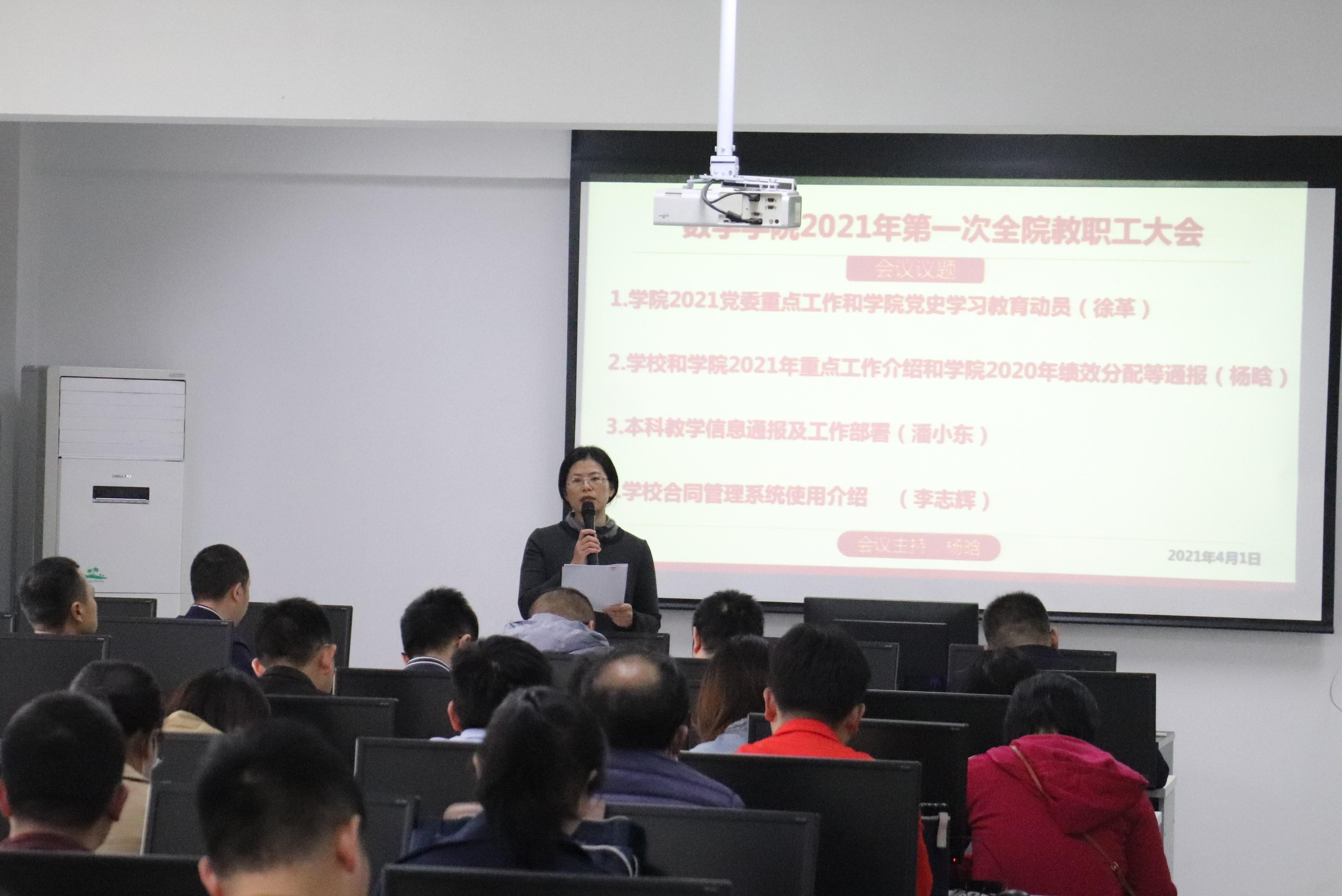 会议第二项,杨晗常务副院长汇报了学校及学院2021年重点工作和学院2020年绩效分配情况。首先,杨院长介绍了学院人事变动情况,并对学院绩效分配工作进行了汇报,杨院长谈到学院应坚持“成绩、成果、成效”原则进一步深化绩效分配和福利政策。随后,杨院长介绍了学校大思政和双一流建设两大牵总工作,学院将在学校提出的学科建设思路的引领下,坚持以立德树人为核心,建设高质量教育体系,深入实施“人才强校主战略”,发挥基础学科的强基作用。接着,杨院长介绍了“1+1152”的工作要点,还对学院课程思政工作、双一流建设、科研团队建设、教学团队建设、平台建设等工作提出了要求。最后,杨院长强调了研究生教育质量提升的重要性,指出必须严格规范研究生培养过程,严格进行研究生论文答辩指导与审查工作。