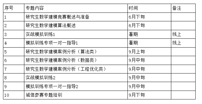 研究生数学建模指导团队根据同学们的报名情况,拟安排如下培训及训练: