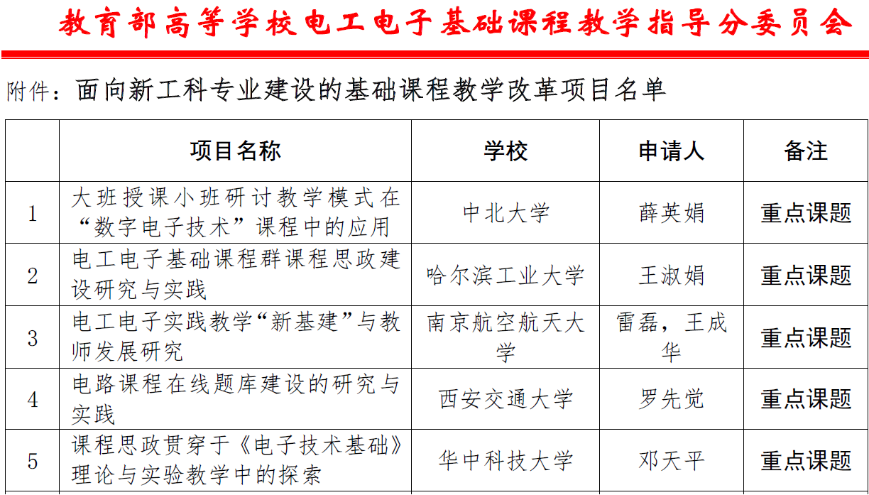 据悉,为了配合教育部工程认证及新工科专业建设的实施,进一步强化落实立德树人根本任务,更好地服务于高校培养适应国家经济、科技、社会发展需要的高素质人才,促进科教融合,提升教学学术水平,深化教育教学改革,培育高等教育教学成果,推动新工科建设再深化、再拓展、再突破、再出发,探索形成中国特色、世界水平的工程教育体系,建设工程教育强国,教育部高等学校电工电子基础课程教学指导分委员会于2021年11月组织开展了面向新工科专业建设的基础课程教学改革项目立项工作。