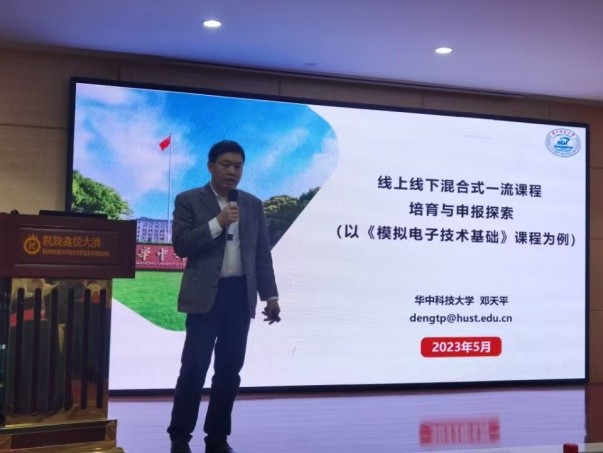 会上,我院邓天平教授作“线上线下混合式一流课程培育与申报探索——以《模拟电子技术基础课程》为例”主题报告,针对“什么是一流课程”“如何建一流课程”“如何用一流课程”的问题,为国家级一流课程的申报和建设提出可行性意见建议。