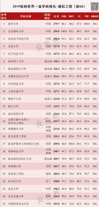 我院通信工程位列软科世界一流学科第九