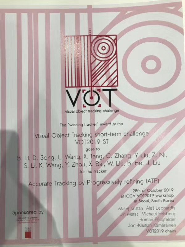 当地时间10月27日,国际计算机视觉大会ICCV 2019(International Conference on Computer Vision)在韩国首尔举行。隶属于ICCV的VOT2019目标追踪挑战赛与本次大会同期举行。在本次挑战赛中,由电信学院VLR研究组研究生宋德嘉、王亮亮、李弼三位同学与百度视觉组工程师组成的联合参赛团队在电信学院白翔教授、刘文予教授和周瑜老师的指导下通过提出ATP算法在短视频追踪赛道斩获冠军。
