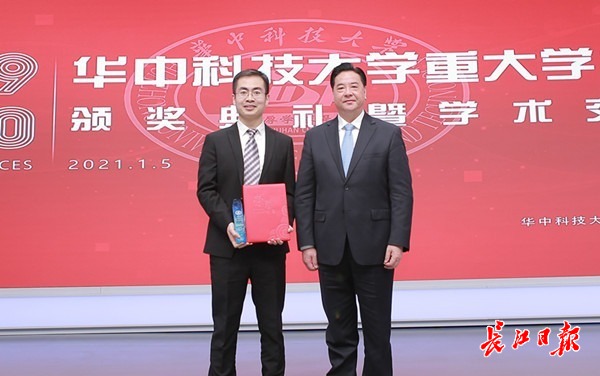 华中科技大学校长李元元院士为尹海帆教授(左)颁奖。 通讯员王潇潇 供图