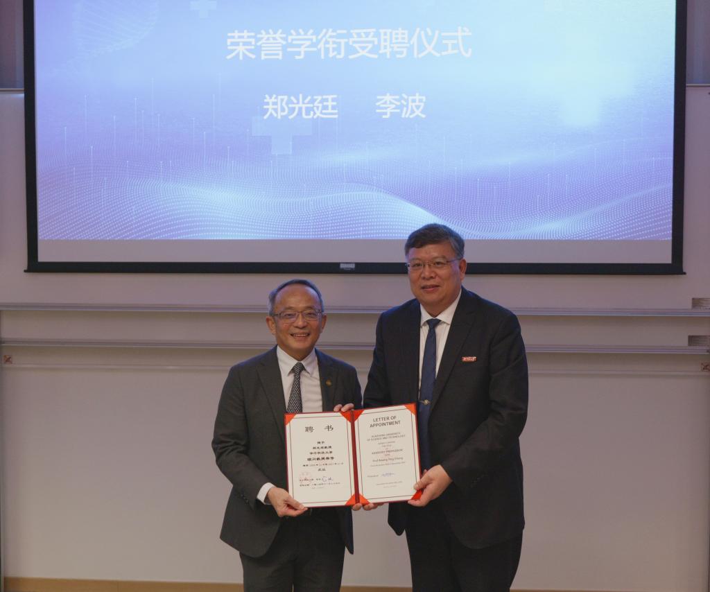 尤政为港科大副校长郑光廷教授和工学院计算机科学与工程学系李波教授颁发我校顾问教授聘书;表示希望两位教授就相关领域学科发展和人才培养提出宝贵指导性意见,在此推动下,两校围绕创新型人才培养、高水平科研合作等方面产生更多标志性成果。