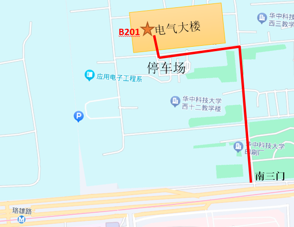 2.步行进校建议选择华中科技大学南三门,进校后可按路线指示到达电气学院南广场,左侧即可见多功能厅B201入口。如从电气学院北广场进入,乘电梯或步梯上二楼即可。