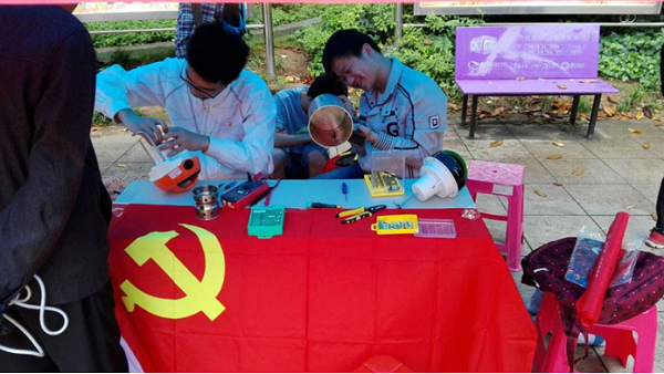 活动伊始,两顶帐篷里已收到了居民们的各种待修电器,居民们的疑问各不相同,同学们不厌其烦认真答复;待修的家用电器种类繁多,同学们充分利用所学专业知识努力攻克。同学们有的独自面对着一件电器细心琢磨,有的几个人凑在一起讨论修理方法,这样的情景,在这个微雨的早晨不断上演。虽然修理的电器上布满了黏油、灰尘、同学们毫不嫌弃,耐心用手小心地擦拭。污渍爬上了同学们的脸颊,留下的却只有同学们开心的笑容,桌上鲜红的党旗映照着学生党员的脸庞。一个上午很快过去,共计上门服务6人次、修理电器20余件,为此次“党员进社区,服务展风采”爱心行动画上了一个圆满的句号。