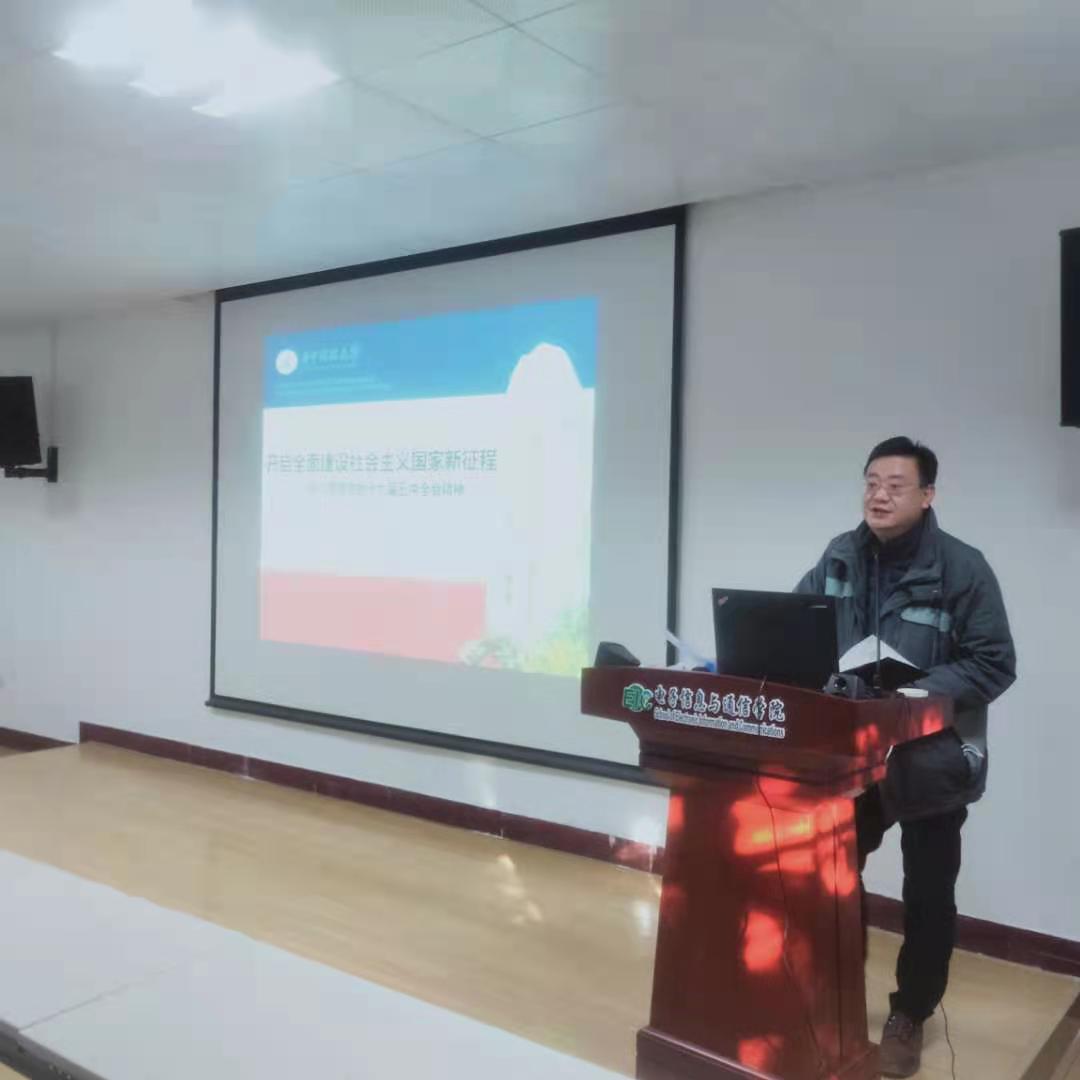 2020年12月31日,电信学院在学院报告厅举行学习贯彻十九届五中全会精神宣讲报告会。学校宣讲团成员、新闻与信息传播学院院长张明新教授以《开启全面建设社会主义国家新征程——学习贯彻党的十九届五中全会精神》为题,为全院教职工作宣讲报告。报告会由学院党委书记郑小建主持。