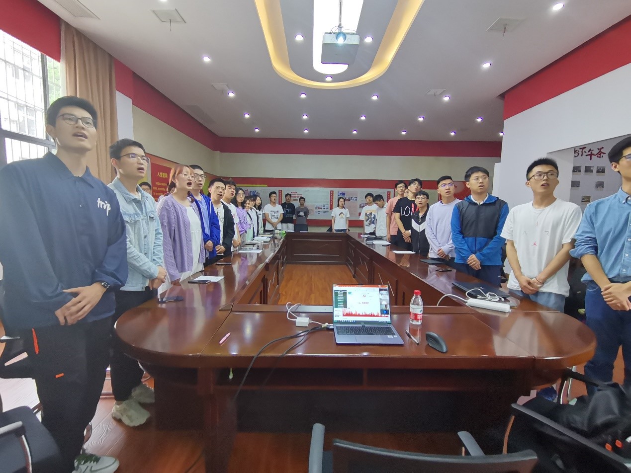 退休党支部书记曹汉强首先带领党员们重温入党誓词。他指出,重温十二句入党誓词是坚定对党的信念、为党的事业奋斗终身的决心的一种形式,牢记入党誓词才能不忘初心、牢记使命。接着,曹汉强对电信本科19级党支部荣获华中科技大学2021年度本科生“先锋党支部”称号表示祝贺。曹汉强指出这一荣誉来之不易,是每个党员共同努力的成果。他希望党员同志们再接再厉、再创辉煌。最后,曹汉强认为红歌承载着特定历史时期的时代精神,重温红歌对时代精神将会有更深的感悟,他提议退休党支部党员们和本科19级党支部党员们一起合唱红歌,重温红色岁月。