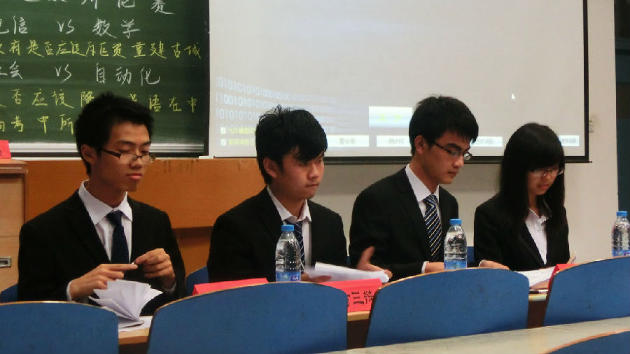 今晚七点于东十二312举行的喻晓之巅辩论赛复赛(十六进八,电信VS数学),我系辩论队出色发挥,以3:0的成绩完胜数学学院,成功挺进八强。