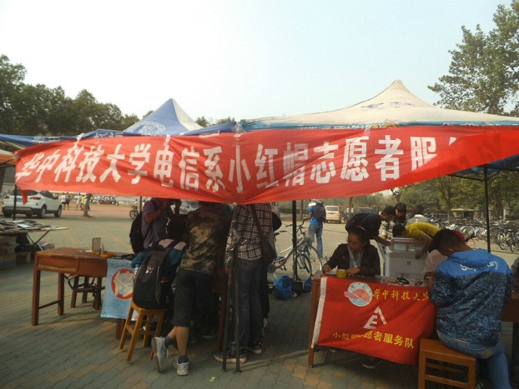 10月12日,电信系小红帽义务维修队大一队员在老队员的带领下在韵苑路口开展路演维修电器。