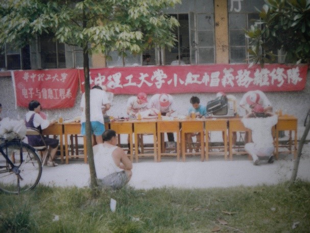 闫瑞尧(下面简称):小红帽成立之初,是隶属于电信系二课部的一部分。当时条件有限,一些维修设备比较缺乏,队员们只有把电信系为我们准备的一间寝室(南二舍327)这作为团队的活动基地。“小红帽”成立后不久,就成为电信系的课外科技活动中心,拥有了自己的工作室。那时小红帽频繁活动于华工(现华中科技大学主校区)学生宿舍和喻园教师小区等地,维修物品大部分为电扇,受众主要为学校老师和校园周边的居民。说实话,在那段时间内,小红帽的条件是较为艰苦的,当初小红帽之所以能够坚持下来,全凭的是老一辈队员们那种不灭的热情以及对知识的追求,正因为有了他们的拼搏努力,才有了现在的、拥有着24年历史的小红帽。