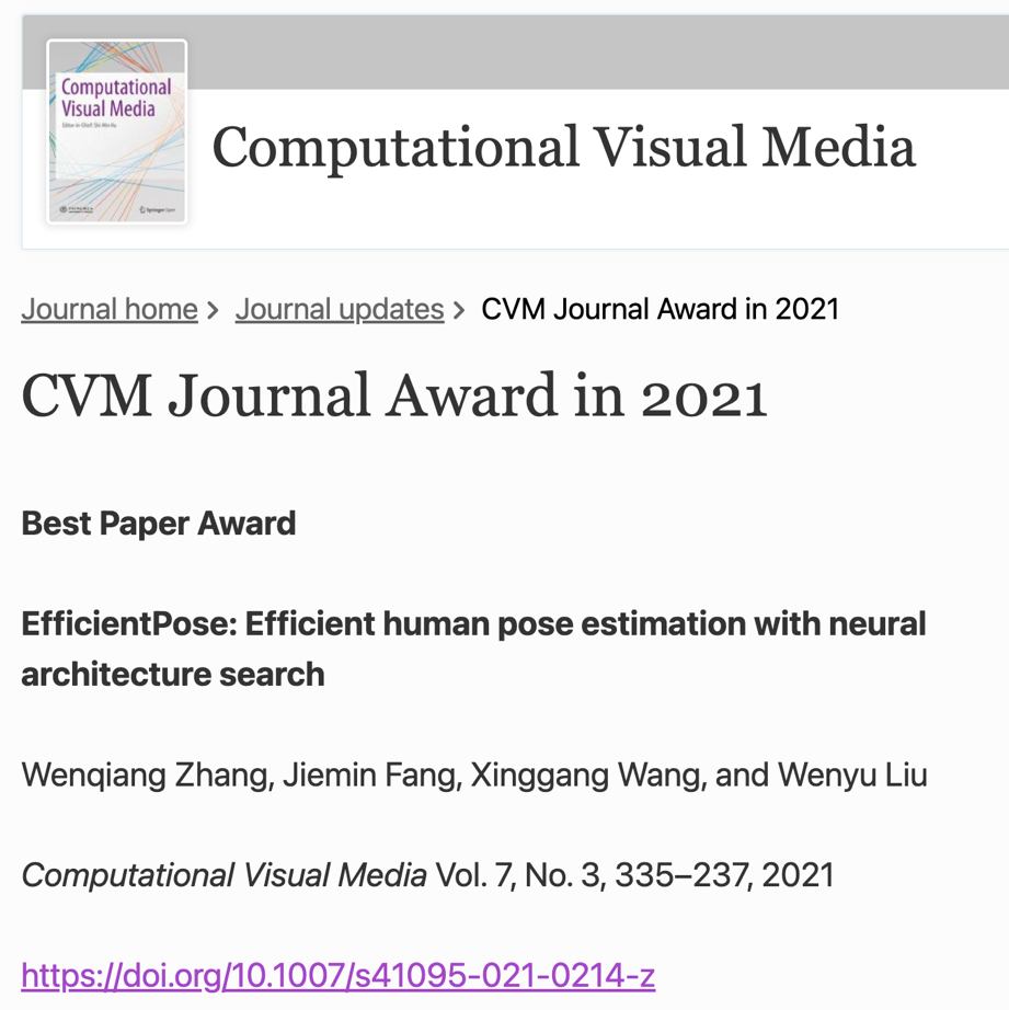 近日,电信学院师生论文“EfficientPose: Efficient Human Pose Estimation with Neural Architecture Search” 获得Computational Visual Media (CVMJ, 计算可视媒体) 2021年度最佳论文奖(Best Paper Award)。论文共同第一作者为电信学院硕士研究生张文强、博士研究生方杰民,通讯作者为电信学院王兴刚副教授和刘文予教授。