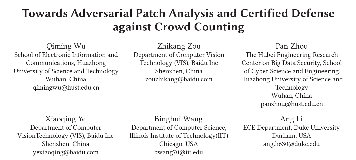 2021年7月4日,计算机多媒体领域最权威的国际顶级学术会议 The 29th ACM International Conference on Multimedia (ACM MM2021) 公布了2021年录取论文,华中科技大学电信学院18级本科生吴启铭同学以第一作者身份的论文 ”Towards Adversarial Patch Analysis and Certified Defense against Crowd Counting” 被录用!