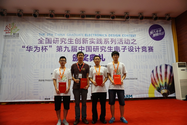 8月18-20日,由教育部学位与研究生教育发展中心、全国工程专业学位研究生教育指导委员会、中国电子学会联合主办,多所知名高校联合承办的第九届中国研究生电子设计竞赛决赛在西安电子科技大学隆重举行。经过激烈的现场测试和团队答辩,由我系马泳教授为领队、周波副教授为指导老师,我系研究生柳成荫、李杨、蔡骏组成的华中科技大学代表队脱颖而出,获得全国总决赛金奖(一等奖)。周波老师获得优秀指导老师奖,柳成荫同学获个人二等奖,另外参赛队还获得由Altera公司颁发的大赛企业专项一等奖。这是我校继2012年在第八届中国研究生电子设计竞赛中首次获得全国一等奖以来再次夺得全国一等奖。