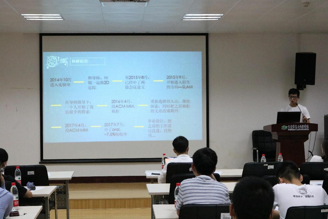 首先是薛唐力分享了自己求职经历,薛唐力科研经历丰富,已发的文章包括1篇一作A类会议ACM Multimedia的oral,1篇导师一作本人二作的C类期刊FCS,在2015年10月去澳大利亚布里斯班开ACM Multimedia会议,获得的荣誉有研究生国家奖学金、校三好学生等等,毕业去向是深圳大疆,工作是三维重建算法工程师,年薪40w+。