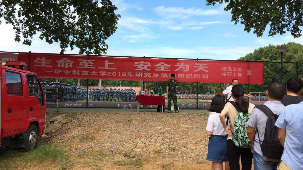 早上9:30,同学们按时到达沁苑土操场演习地点,按时签到。集合完毕后,校保卫处的工作人员向同学们简明扼要地阐述了消防安全工作的重要性以及校园和实验室内进行消防安全工作的特点,正式开始了本次演习。