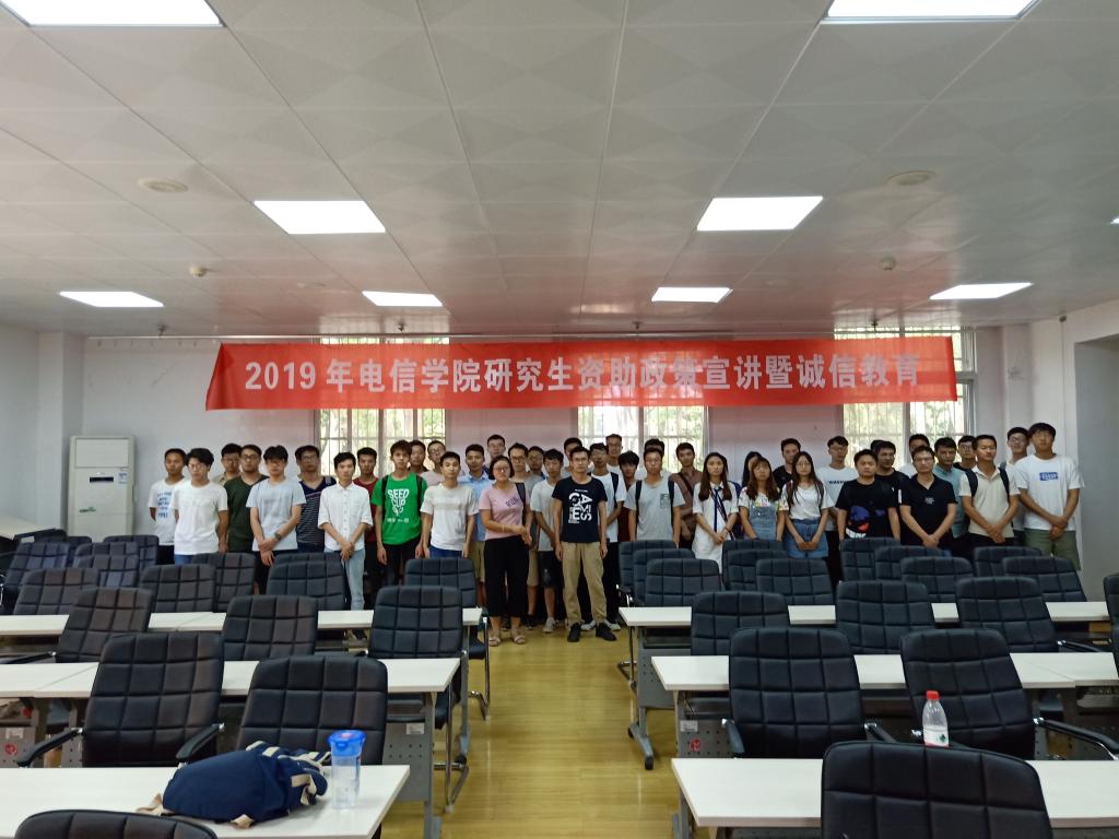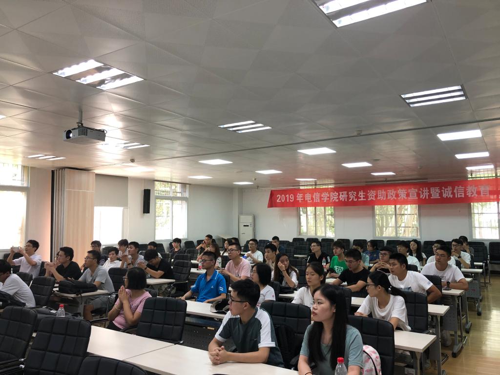 为宣传学校的资助政策,培养学生的诚信品质,强化资助工作育人成效,9月4号中午13点,电信学院邀情校资助中心在电信学院报告厅南1楼西203开展研究生资助政策宣讲暨诚信教育,参加本次活动的有校研究生会资助管理中心洪镇和、电信学院德育助理、以及电信学院2019年申请办理国家助学贷款的研究生同学。