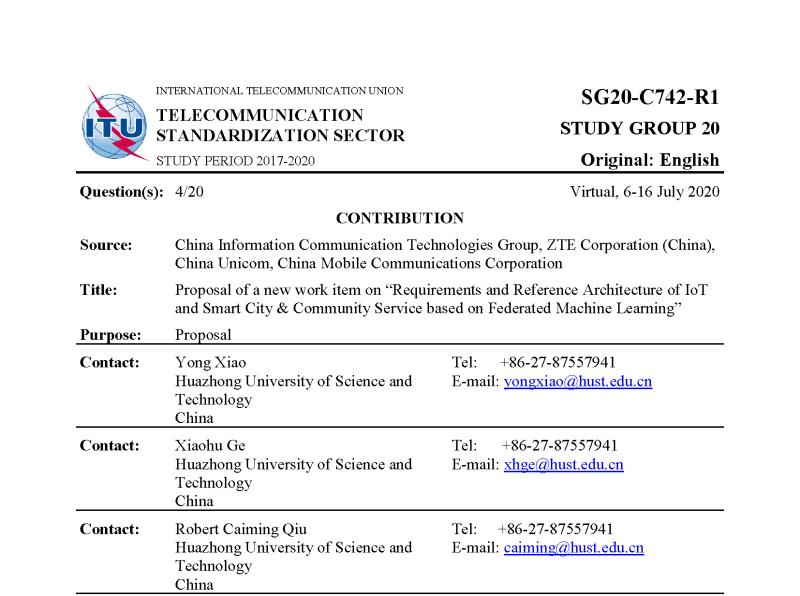 7月6日至16日,国际电信联盟第20研究组(ITU SG20)全体会员会议召开。由我院肖泳教授、葛晓虎教授和邱才明教授牵头,联合中国信科、中兴通讯、中国联通和中国移动向国际电信联盟(ITU-T)提交的国际标准提案“面向物联网和智慧城市/社区的联邦机器学习需求及参考架构”(Requirements and Reference Architecture of IoT and Smart City & Community Service based on Federated Machine Learning)获得批准正式立项。该标准提案是全球首个面向物联网与智慧城市的联邦学习参考架构。