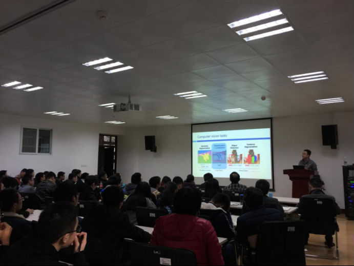 许永超老师从卷积神经网络的基础出发,详细讲解了卷积神经网络的基本概念和原理,并对一些常用的网络结构进行简要介绍。随后,许老师结合自身研究领域,对卷积神经网络在例如边缘检测、图像分割、特征匹配等方面的应用进行了详细讲解。王兴刚老师则以目标检测与识别方面的应用为重点,就目前国内外各研究组在目标检测和识别方面的工作进行了介绍,分享并讲解了该领域的一系列经典论文。最后,王老师介绍了常用深度学习平台,为在座的各位老师和同学们给出了实践性指导。