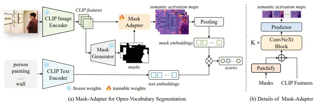 当前开放词汇分割主要采用先分割出掩码再对掩码进行分类的范式,由于模型需要根据输入的文本类别进行区域的识别,这要求模型既能够保持多模态模型的原有泛化性又要有细粒度的感知能力,但受限于文本和掩码两种模态之间巨大的隔阂,当前开放词汇分割模型在掩码分类上的精度不高,限制了模型的效果。