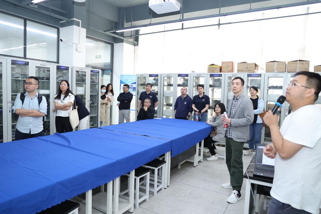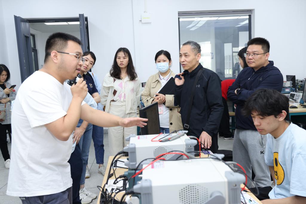 在参观环节,老师们在东十七楼F203教室,看到学生们正在使用实验教学数字化系统进行线下插板实验。该系统包含了预习检测、实验数据采集、在线报告和成绩报表统计等功能。通过该数字化系统,可以实现线下实验的全过程数字化。数据采集功能可以自动判断实验结果是否正确,并杜绝实验数据造假,也帮助老师掌握实验进度、了解学情。