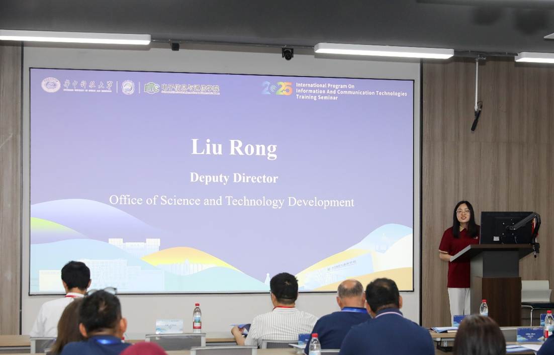 学校科学技术发展院副处长刘荣致欢迎辞。她向学员们介绍了华中科技大学概况,强调国际化是华科大追求卓越的重要战略。她期望通过本次培训,分享中国在ICT领域的经验,促进发展中国家间的科研合作、技术交流与人才互动,为未来共同申报国际合作项目、承担政府间合作任务奠定坚实基础,并预祝培训班圆满成功。