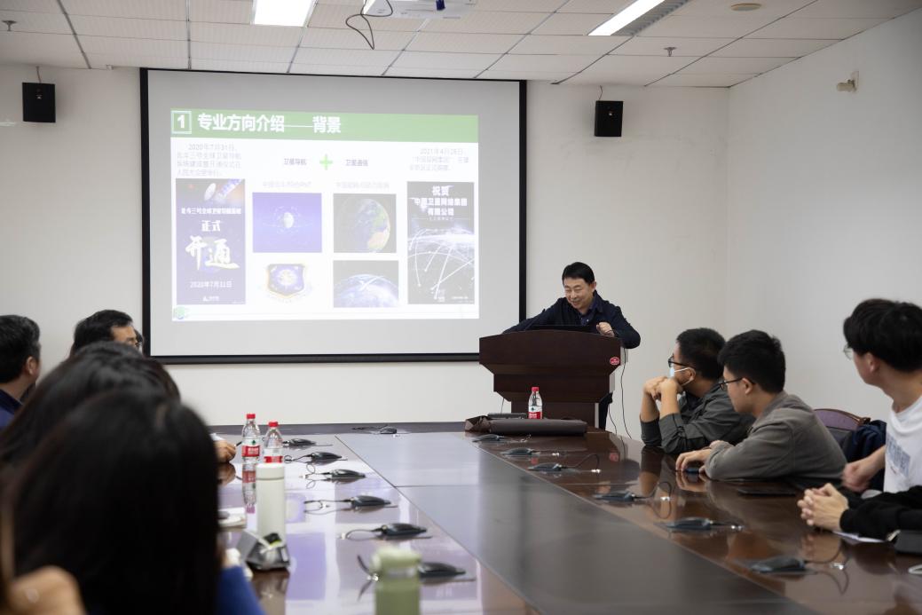 为了让同学们对方向的专业方向课程有更多的了解,魏老师向同学们介绍了空间通信方向的课程安排与知识体系。他强调空间通信方向不仅要踏实学好理论知识,还要积极联系工程实践,并且向同学们展示了学院与中国空间技术研究院以及众多行业相关企业的合作交流情况。