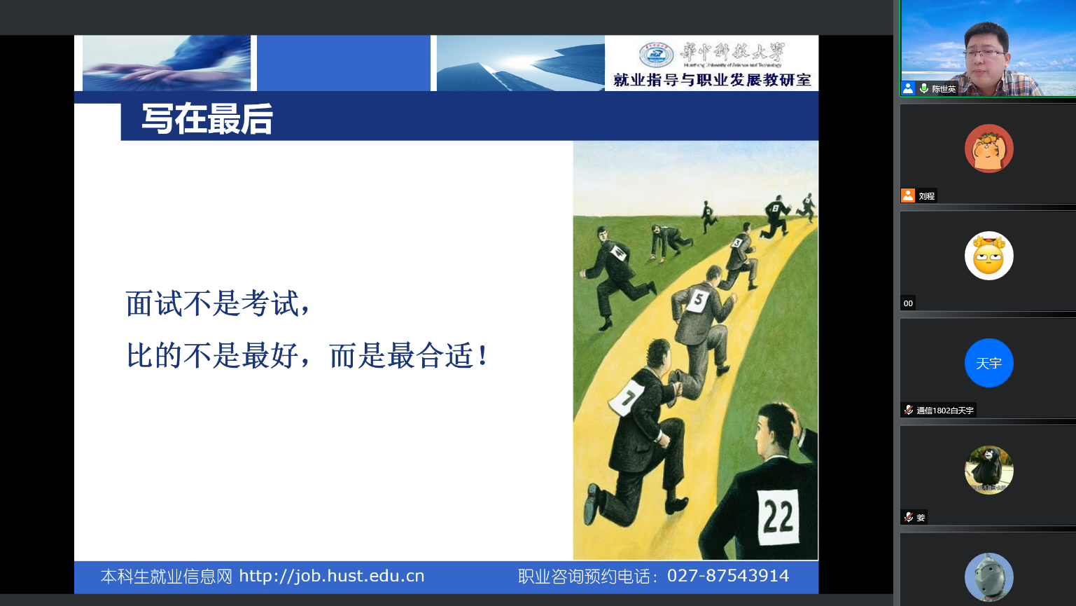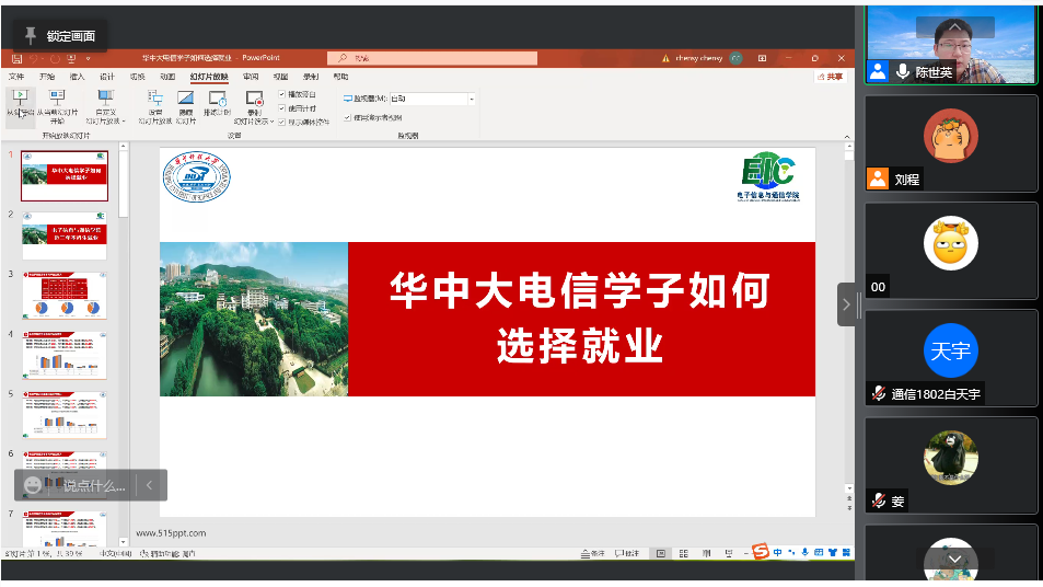 3月10日晚7点,电子信息与通信学院第15期“导师有约”活动在线上顺利举行。电子信息与通信学院党委副书记陈世英为电信学子开展就业选择和求职技巧培训,近300名电信学子参与了本次活动。